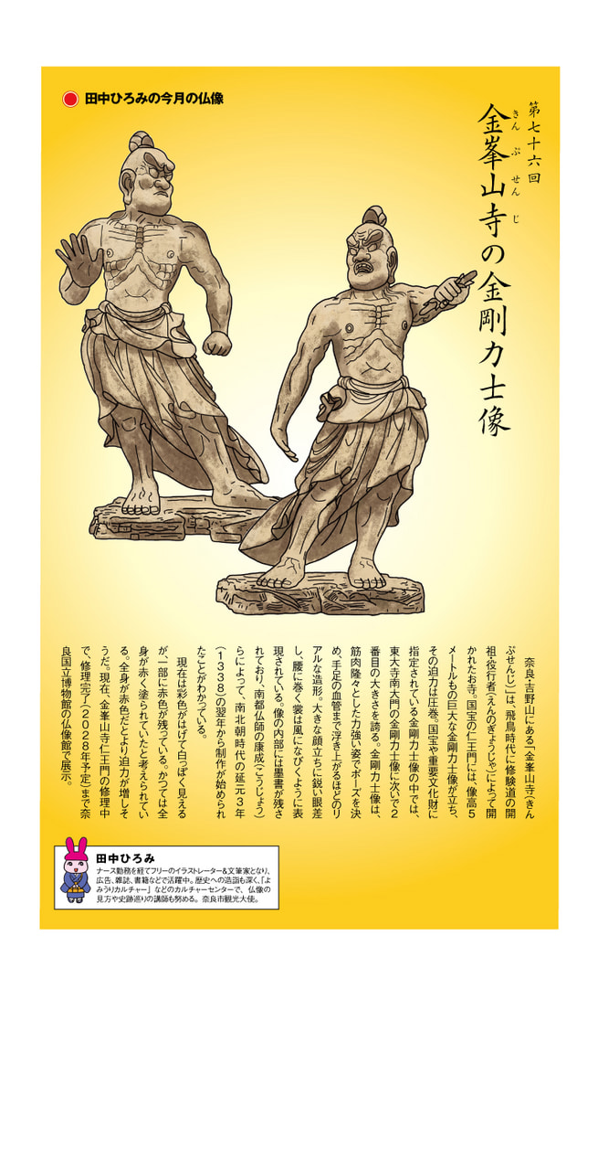奈良・吉野山にある「金峯山寺(きんぷせんじ)」は、飛鳥時代に修験道の開祖・役行者(えんのぎょうじゃ)によって開かれたお寺。国宝の仁王門には、像高5メートルもの巨大な金剛力士像が立ち、その迫力は圧巻。国宝や重要文化財に指定されている金剛力士像の中では、東大寺南大門の金剛力士像に次いで2番目の大きさを誇る。金剛力士像は、筋肉隆々とした力強い姿でポーズを決め、手足の血管まで浮き上がるほどのリアルな造形。大きな顔立ちに鋭い眼差し、腰に巻く裳(も)は風になびくように表現されている。像の内部には墨書が残されており、南都仏師の康成(こうじょう)らによって、南北朝時代の延元3年(1338)の翌年から制作が始められたことがわかっている。現在は彩色がはげて白っぽく見えるが、一部に赤色が残っている。かつては全身が赤く塗られていたと考えられている。全身が赤色だとより迫力が増しそうだ。現在、金峯山寺仁王門の修理中で、修理完了(2028年予定)まで奈良国立博物館の仏像館で展示。